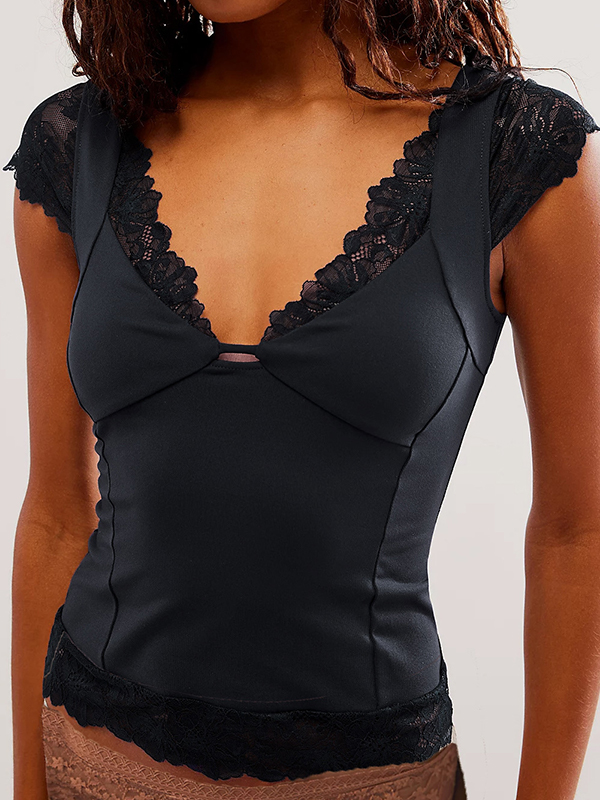 Lace Trim V Neck Short Sleeve Tee