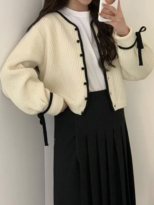Contrast Trim Bow Decor Knit Cardigan