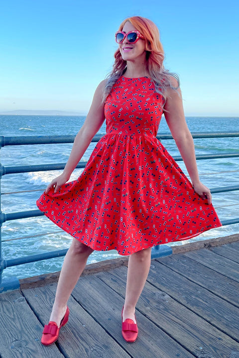 Vestido retro de corte entallado y falda acampanada con estampado de gatos