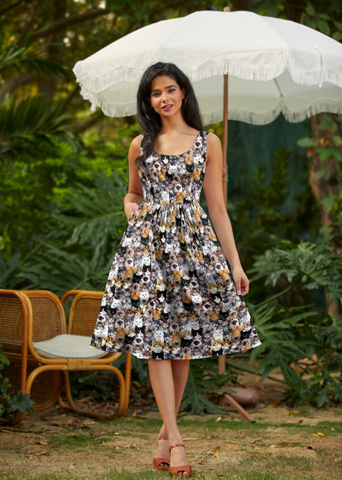 Vestido retro de corte ajustado y acampanado con gatos realistas