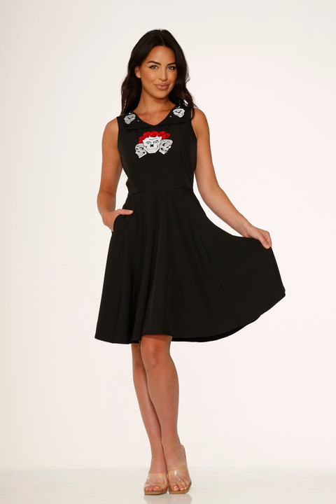 Vestido swing bordado con calaveras de rosas