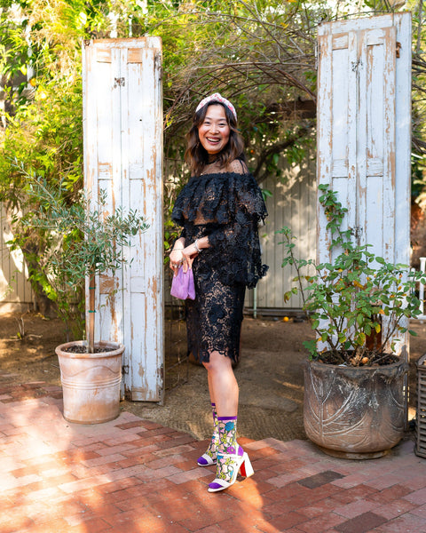 Inspirados en La Bella y la Bestia, nuestros calcetines transparentes con estampado floral de vidrieras presentan flores moradas, amarillas y azules junto con piezas abstractas rosas que crean la ilusión de una vidriera. Acabados con talón, puntera y puño morados para un toque perfecto de elegancia y feminidad.