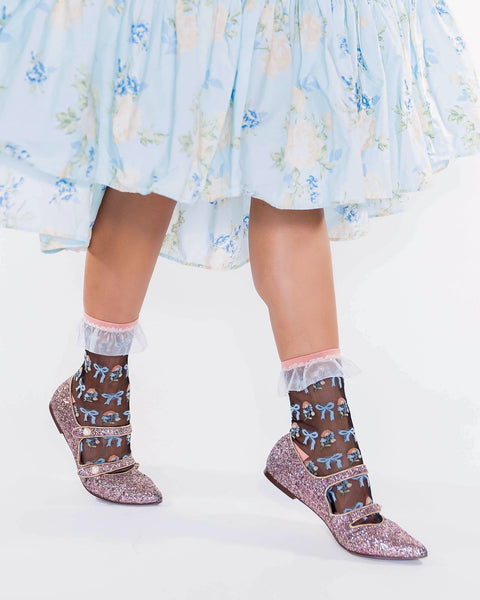 Inspirado en la época de la Regencia de Bridgerton, este calcetín tobillero con volantes presenta flores en tonos pastel y delicados lazos sobre tela negra transparente. Acabado con un puño blanco con volantes transparentes para un toque femenino. Calcetín complementario del calcetín transparente con volantes y estampado floral repetido: ¡consigue uno para ti y otro para tu mejor amiga!