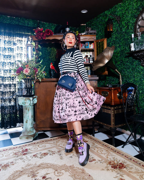 Nuestros calcetines Dopamine Cats, los más vendidos, ahora están disponibles como gatos nocturnos para la temporada de Halloween. Con un diseño simétrico, gatos negros con puntos rosas están rodeados de árboles ondulados, lunas y estrellas en una paleta de colores morado, negro y rosa pálido. El accesorio perfecto e inesperado para todos tus atuendos de otoño y Halloween.