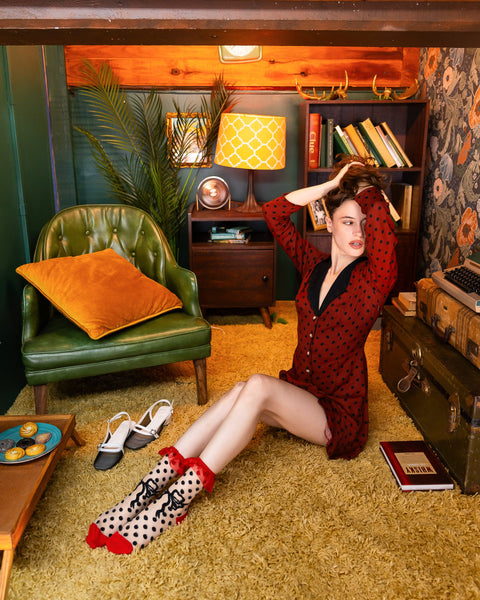 Nuestro calcetín transparente con lazo y volantes de lunares no es un calcetín de lunares cualquiera. Le añadimos el toque Sock Candy con un inesperado lazo extragrande y un puño con volantes rojos, manteniendo los colores clásicos en negro y rojo. Este calcetín aporta a tu vestuario la energía del viejo Hollywood combinada con un estilo coqueto.
