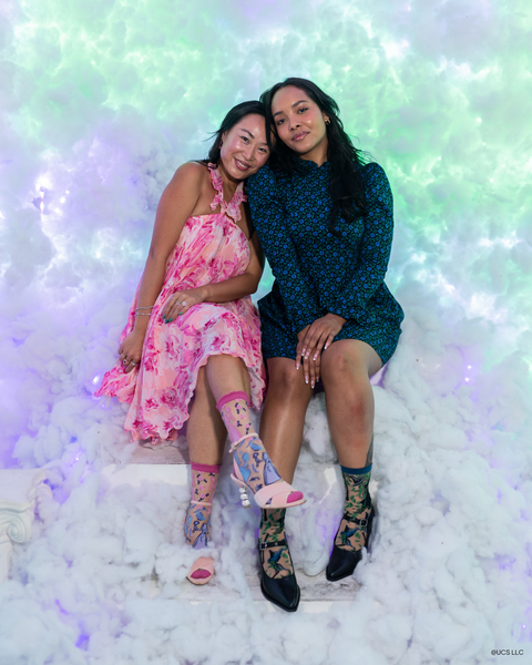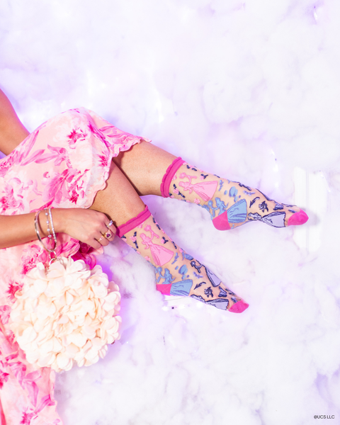 Canaliza el brillo rosado perfecto de Glinda con nuestros calcetines transparentes Glinda Silhouette, que presentan siluetas de Glinda, burbujas, mariposas y flores. Diseñados en tonos rosa y morado para simbolizar sus looks de la primera película (rosa) y la segunda película (morado). Acabados con un divertido puño con volantes para aportar un toque de encanto teatral a tu look diario.