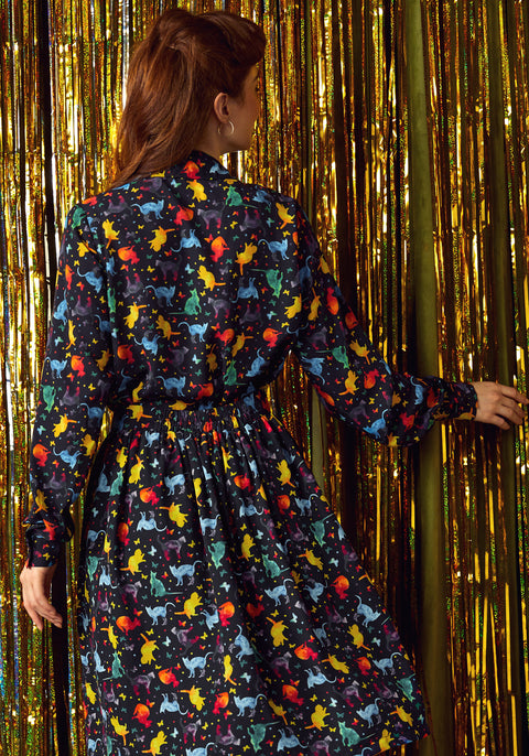 Lánzate a la fabulosa felina con la camisa abotonada All About Me de nuestra marca ModCloth. Esta monada cósmica presenta una constelación de gatos coloridos retozando sobre un fondo negro medianoche, porque el espacio es mejor con bigotes. Ligera y con una caída perfecta, está diseñada con un cuello clásico, cierre de botones y mangas largas que la hacen ideal para usarla en capas o sola. Combínala con jeans para un look casual o métela por dentro de una falda para un estilo de otro mundo.