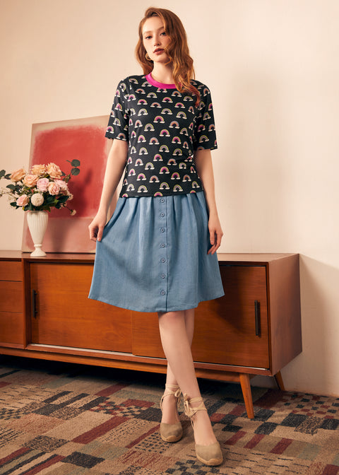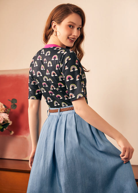 Inspirada en el estilo Britannia de los años 60 y 90, esta camiseta corta de la marca ModCloth es una prenda básica divertida y elegante que se convertirá en una pieza favorita para usar durante todo el año. Confeccionada en un suave y elástico tejido de punto acanalado, esta camiseta de manga tres cuartos luce rayas azules, blancas y rojas por toda la prenda para un estilo ultrarretro. Con un ribete rojo en contraste en el cuello redondo, esta camiseta ajustada es una opción ideal para añadir un básico elegante a tu armario.