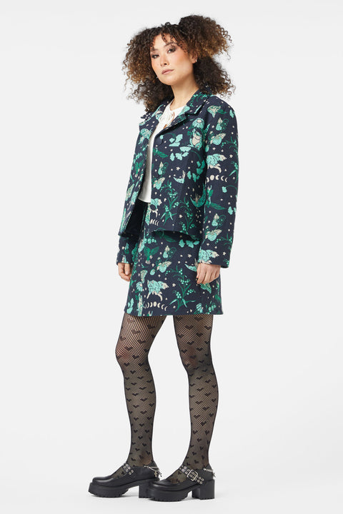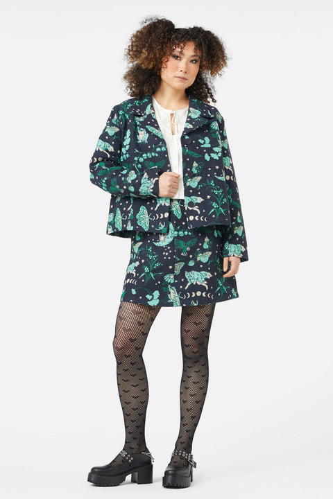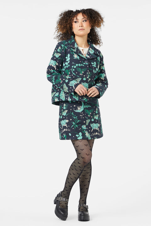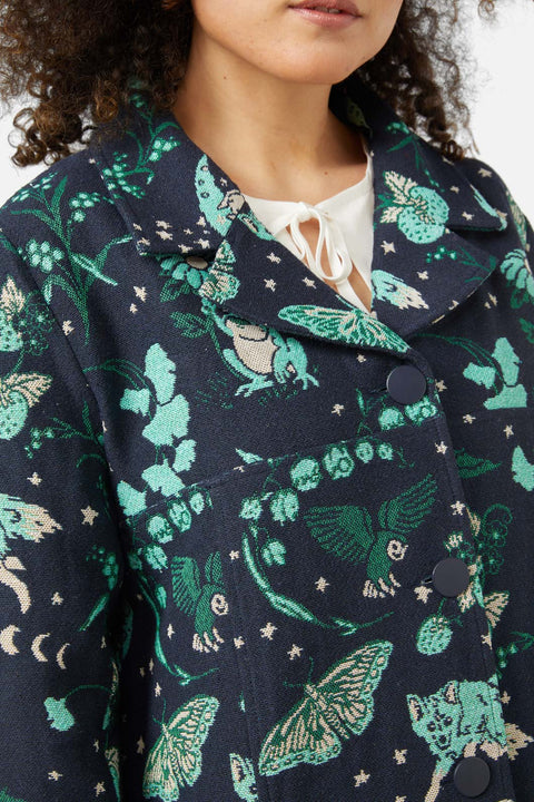 Adéntrate en lo místico con la chaqueta Bosque Prohibido, que exhibe un intrincado arte en brocado que añade un toque único a cualquier atuendo. Esta chaqueta de corte recto presenta un cuello con forma y cierre de botones, creando un look audaz con un toque encantador. Confeccionada en brocado tejido, proporciona textura y profundidad, convirtiéndola en una pieza excepcional. Disponible en un estampado multicolor.