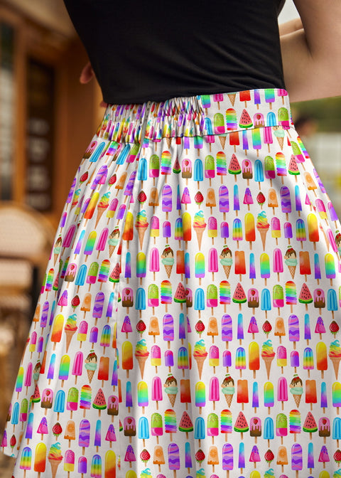 ¡La falda más divertida y coqueta! Se muestra en nuestro estampado de helado. Esta falda de estilo vintage cuenta con una cintura elástica en la parte trasera para mayor comodidad y un cierre de cremallera en la parte posterior.
