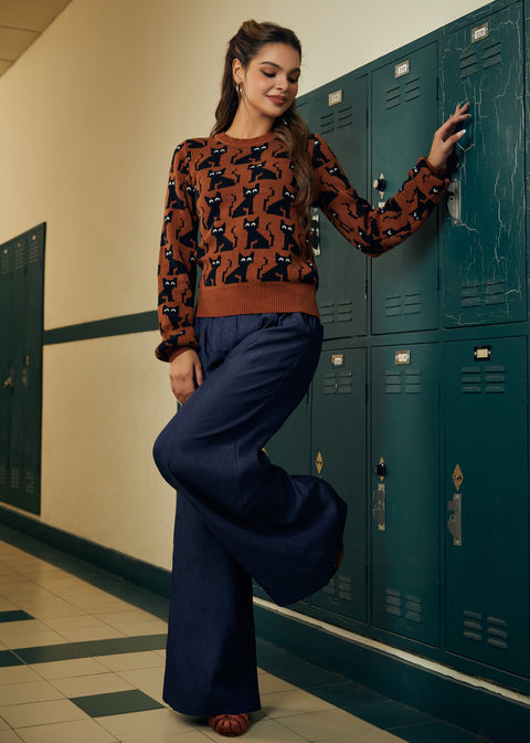 Añade un toque de picardía a tu armario con el jersey de cuello redondo Notes of Nostalgia de nuestra marca ModCloth. En color Rustic Purr, este acogedor jersey presenta un estampado integral de curiosos gatos negros, cuyos grandes ojos resaltan sobre un cálido fondo color óxido. Con su clásico cuello redondo, ribete acanalado y corte relajado, es una prenda ideal para combinar con otras capas, perfecta tanto para paseos otoñales como para reuniones de la temporada de Halloween. Combínalo con tus vaqueros favoritos o una falda divertida para un look que es a la vez acogedor, original y fantástico.