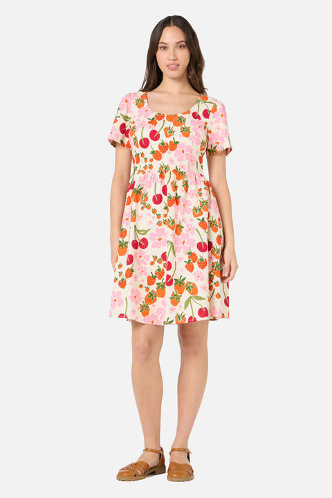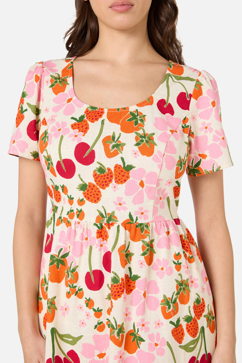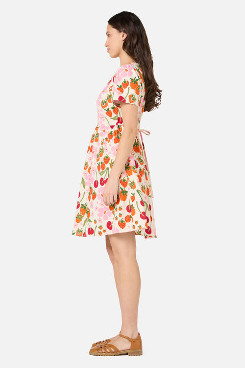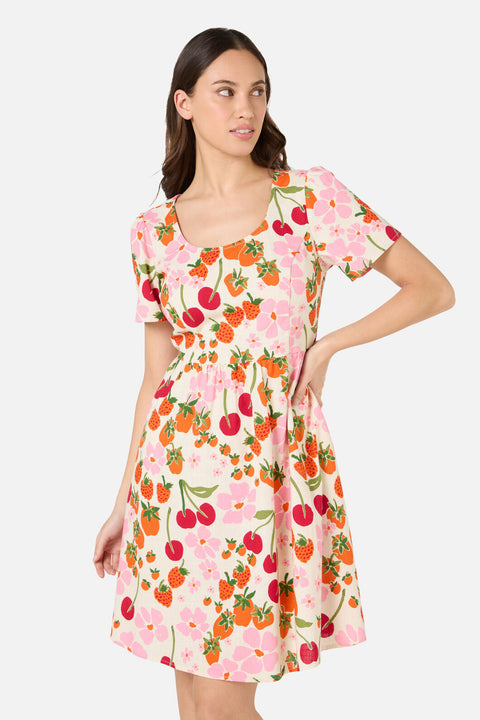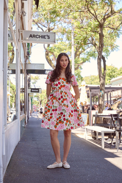 Un dulce minivestido de verano en suave color crema, con un encantador estampado pintado a mano de cerezas, fresas y margaritas frescas. Ligero, divertido y perfecto para un picnic, este estilo combina la dulzura de inspiración vintage con la comodidad de un atuendo veraniego.