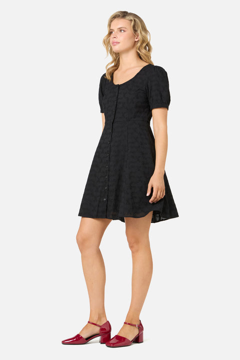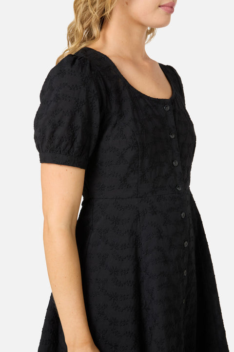 Femenino y atemporal, este minivestido negro de broderie anglaise floral aporta un toque de encanto vintage a tu vestuario diario. Con un escote ligeramente redondeado, mangas abullonadas y una falda acampanada, es la combinación perfecta de romanticismo y comodidad.