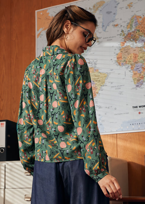 Croissants, vino, gatos a rayas y la Torre Eiffel bailan sobre un fondo verde, mientras que la silueta relajada del cuello camp mantiene un estilo desenfadado. Con mangas largas, cierre de botones y el toque justo de encanto retro, esta camisa es tu pasaporte a divertidas aventuras cotidianas, sin necesidad de tarjeta de embarque.