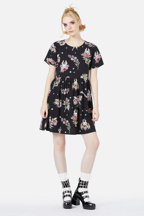 El estampado integral ‘Fruity Bats’, una encantadora colaboración artística con la artista Ella Mobbs, añade un toque audaz y colorido a este vestido. Hecho de viscosa tejida suave, está disponible en un llamativo negro o un lila de ensueño, ideal para aquellos que quieren hacer una declaración con su estilo.