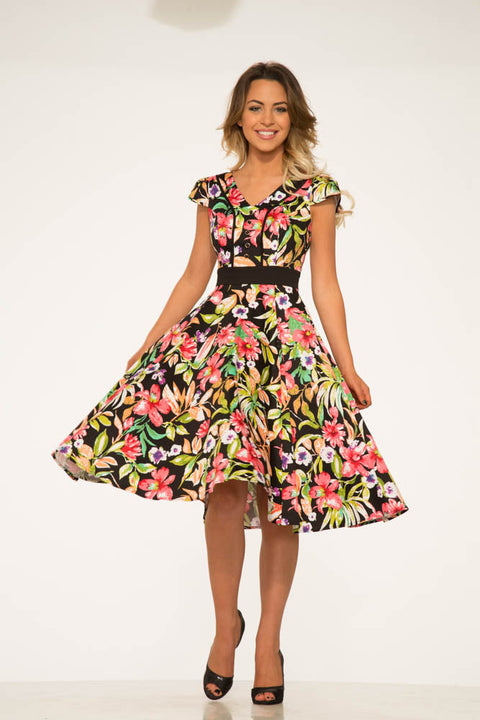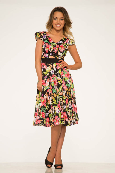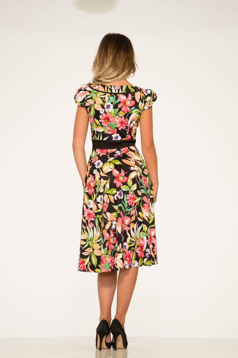 Añade un toque tropical a tu armario con el vestido acampanado floral Orchid Bloom Tropical Mix. Con un vibrante estampado floral en tonos vivos de rojo, verde, amarillo y blanco sobre un elegante fondo negro, este vestido irradia un aire veraniego y una elegancia natural. Su silueta favorecedora se ve realzada por un corpiño ajustado con mangas cortas y una cinturilla contrastante que ciñe la cintura, dando paso a una clásica falda acampanada. Confeccionado con una suave mezcla de algodón y elastano para mayor comodidad y facilidad de uso, y con cremallera lateral para ponérselo fácilmente.