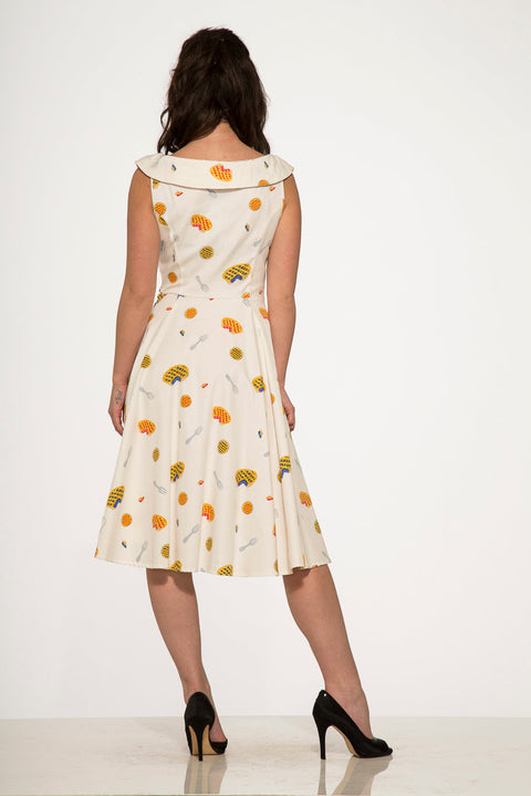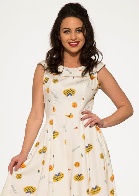 Sirve una pizca de fantasía retro con el vestido Orchid Bloom Pie en blanco roto. Adornado con divertidos motivos de tartas y utensilios en tonos cálidos y soleados, este encantador vestido de corte evasé es la combinación perfecta de diversión y sofisticación. La suave mezcla de algodón y elastano garantiza un ajuste favorecedor y la elasticidad justa, mientras que la cremallera lateral facilita ponérselo. Ya sea para un picnic o una reunión informal en el jardín, este vestido aporta un toque de personalidad encantador a tu armario.