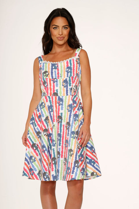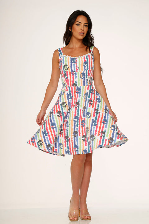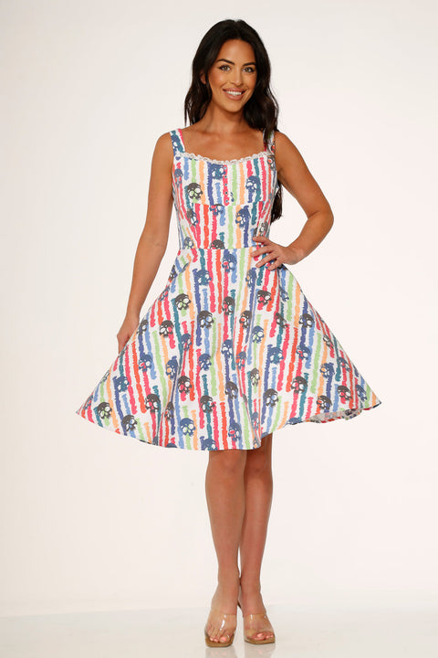 ¡Aporta energía y un toque de color a tus giros con el vestido Orchid Bloom White Skulls Rainbow Swing! Con un divertido estampado de vibrantes calaveras arcoíris sobre un fondo blanco impecable, este vestido de corte retro con vuelo es una mezcla perfecta de dulzura y rebeldía. Confeccionado con una cómoda mezcla de algodón y elastano, está listo para el sol, las sonrisas y para destacar dondequiera que vayas.