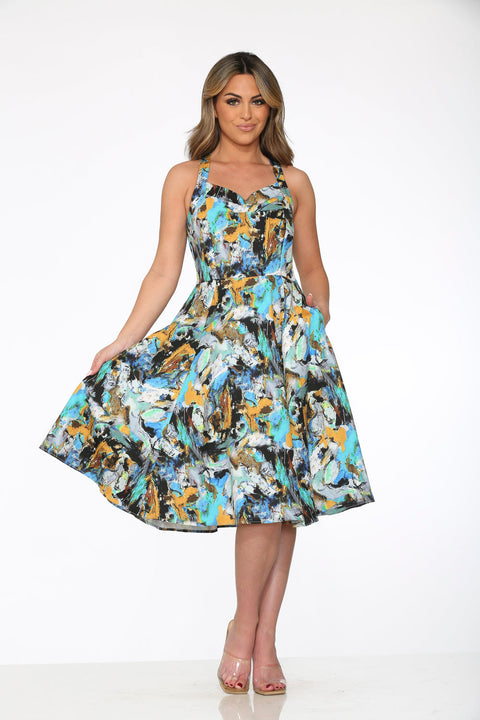 Un precioso vestido swing femenino con un suave estampado pictórico azul y rosa. Con una silueta favorecedora y un tejido elástico cómodo, este estilo fácil de llevar es perfecto para todo, desde salidas diurnas hasta planes nocturnos.