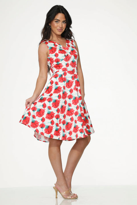El romance siempre está en flor con el vestido de vuelo Orchid Bloom de rosas blancas y rojas. Con un jardín de llamativas rosas rojas sobre un lienzo blanco impecable, esta belleza de inspiración vintage es tan clásica como cautivadora. Con su favorecedor corpiño ajustado, falda amplia y suave mezcla de algodón elástico, es perfecto para picnics, fiestas o tu próxima entrada triunfal.