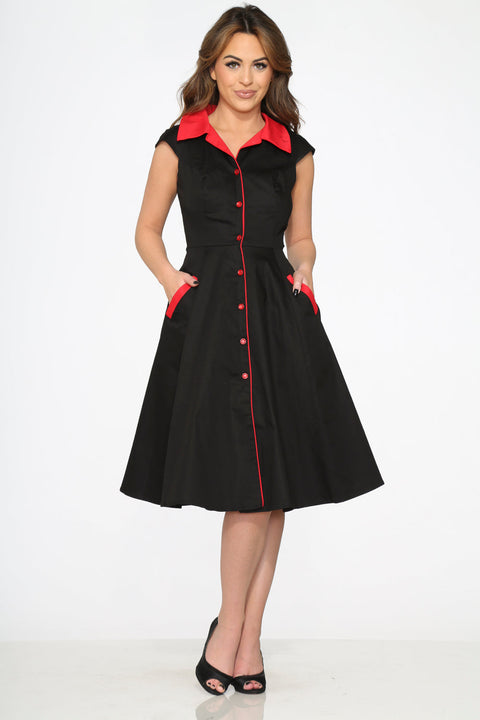 Atemporal con un toque atrevido, el vestido Black Red Trim Swing de Orchid Bloom combina el estilo vintage con la confianza moderna. La clásica base negra se realza con llamativos detalles en rojo, convirtiéndolo en una opción destacada tanto para el día como para la noche.