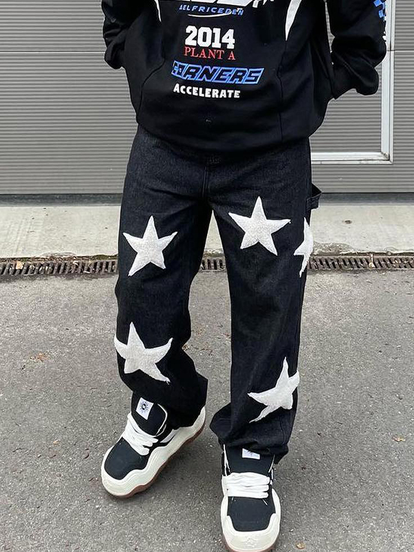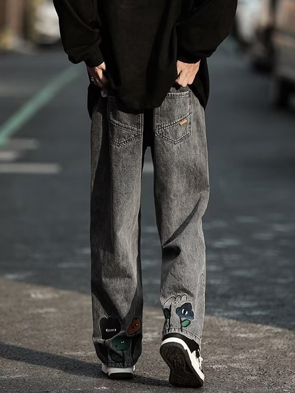 Men’s Distressed Interesting Flower Embroidery Loose Jeans