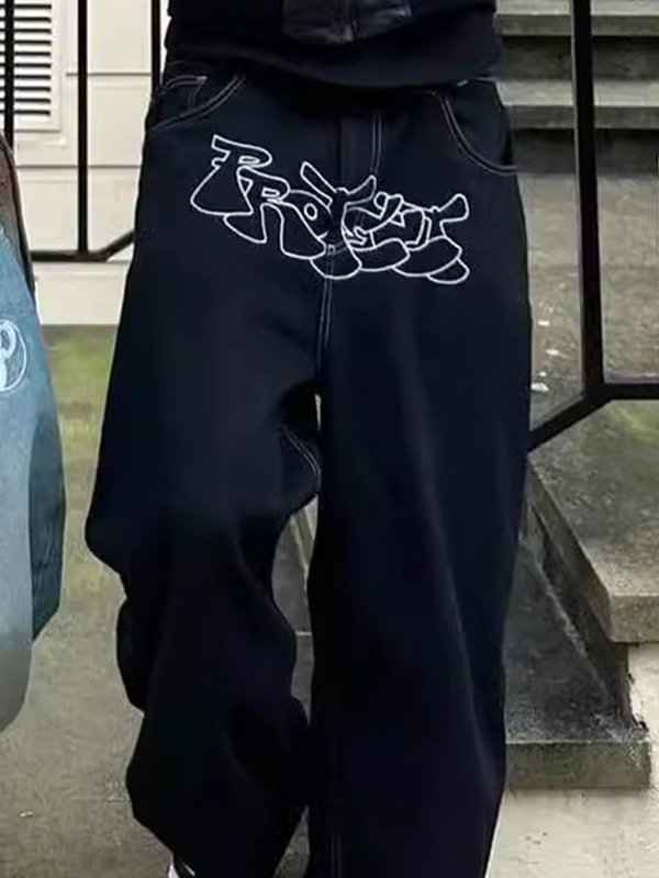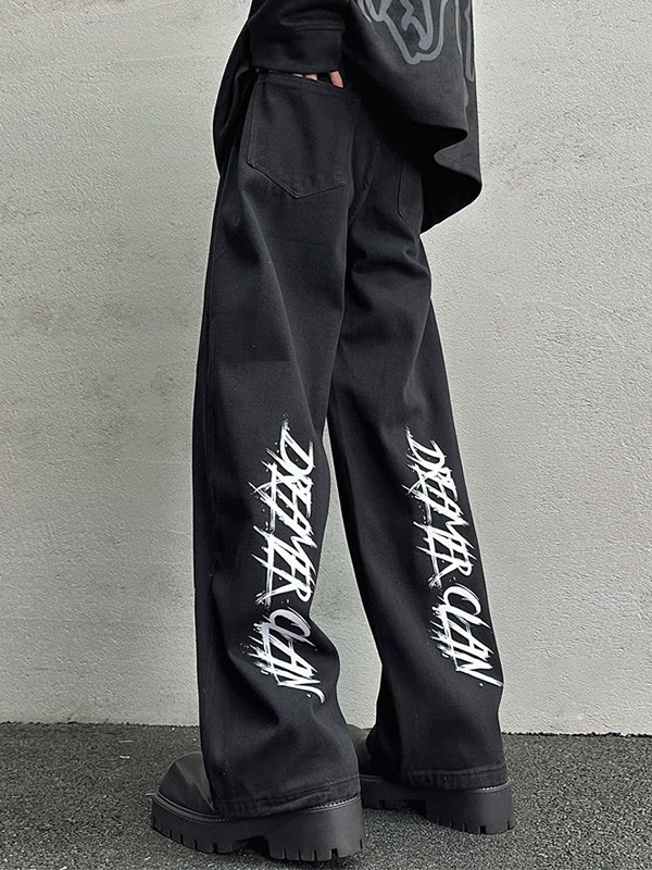 Vintage Yellow Mud Letter Loose Straight Jeans
