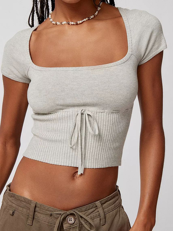 Solid Color Lace Hem Square Neck Crop Long Sleeve Knit