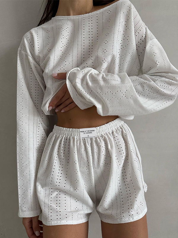 Solid Cutout Loose Long Sleeve Tee&Shorts Set
