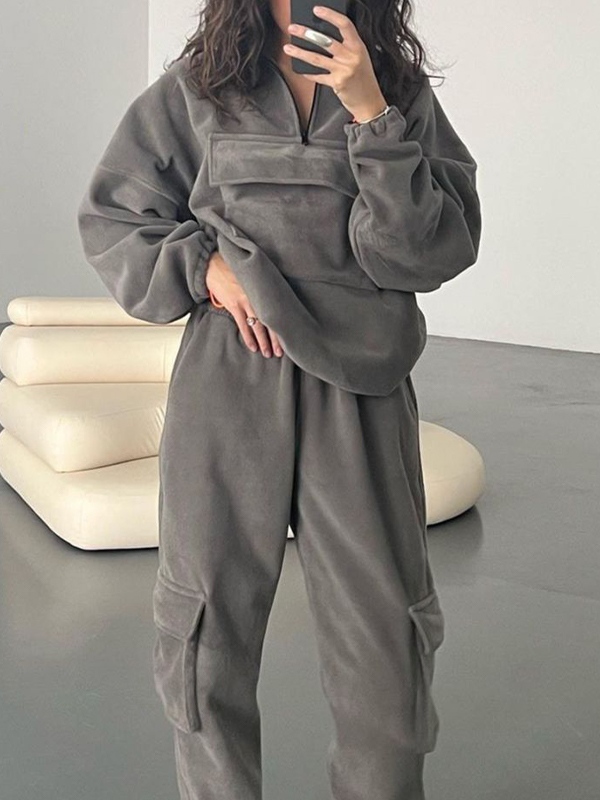 Solid Half Zip Flap Pocket Sweatshirt&Bound Feet Sweatpants Set