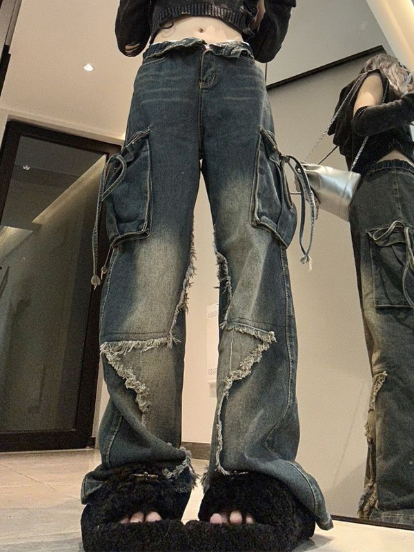 Hip Pop Multi Pocket Raw Trim Tie Up Cargo Jeans