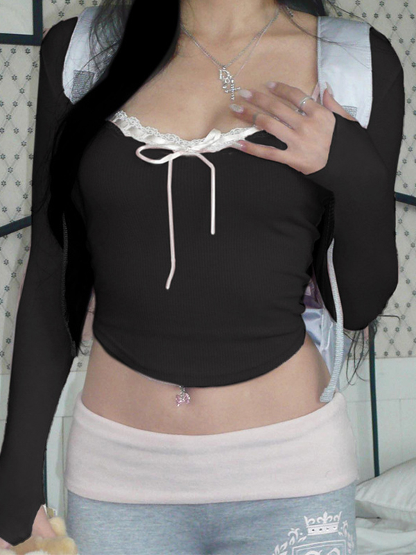 Lace Splice Tie Front Square Neck Long Sleeve Knit