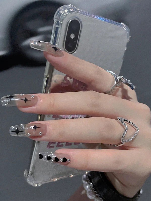 24pcs Rhinestone Decor Heart Star Press On Nails