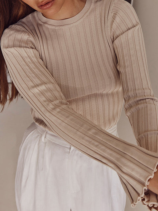 Solid Ribbed Crew Neck Long Sleeve Knit